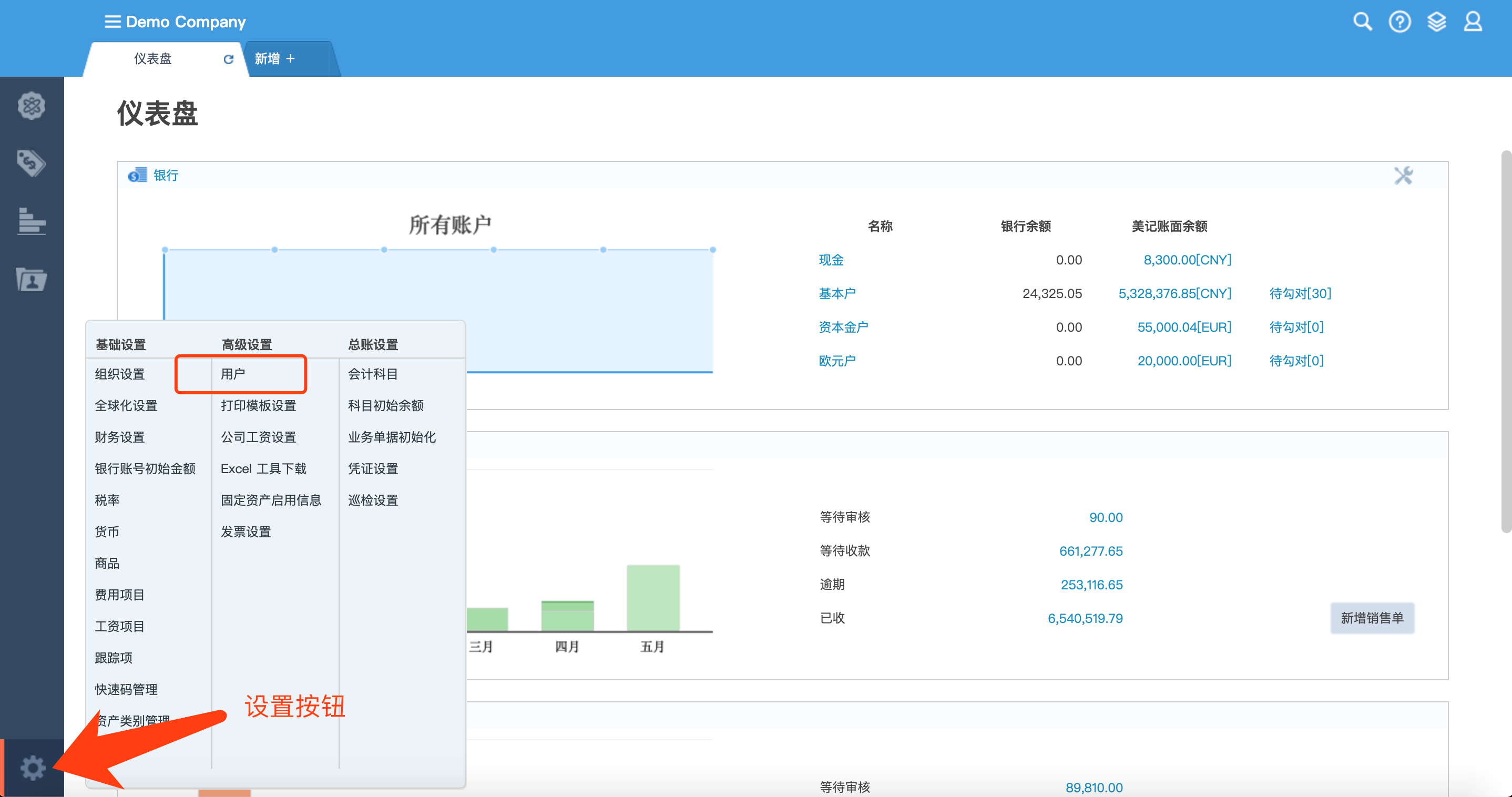 在美记系统主页点击左下角设置按钮,选中“用户”;